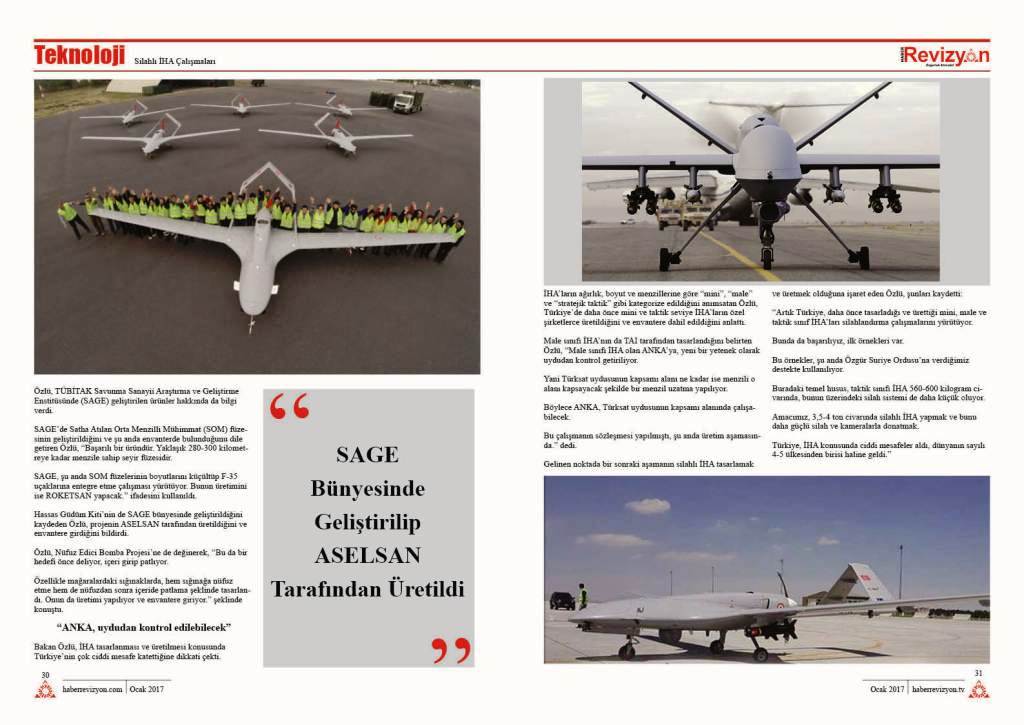 “Artık Türkiye, daha önce tasarladığı ve ürettiği mini, male ve taktik sınıf İHA’ları silahlandırma çalışmalarını yürütüyor. Bunda da başarılıyız, ilk örnekleri var. Bu örnekler, şu anda Özgür Suriye Ordusu’na verdiğimiz destekte kullanılıyor. Buradaki temel husus, taktik sınıfı İHA 560-600 kilogram civarında, bunun üzerindeki silah sistemi de daha küçük oluyor. Amacımız, 3,5-4 ton civarında silahlı İHA yapmak ve bunu daha güçlü silah ve kameralarla donatmak. Türkiye, İHA konusunda ciddi mesafeler aldı, dünyanın sayılı 4-5 ülkesinden birisi haline geldi.”
